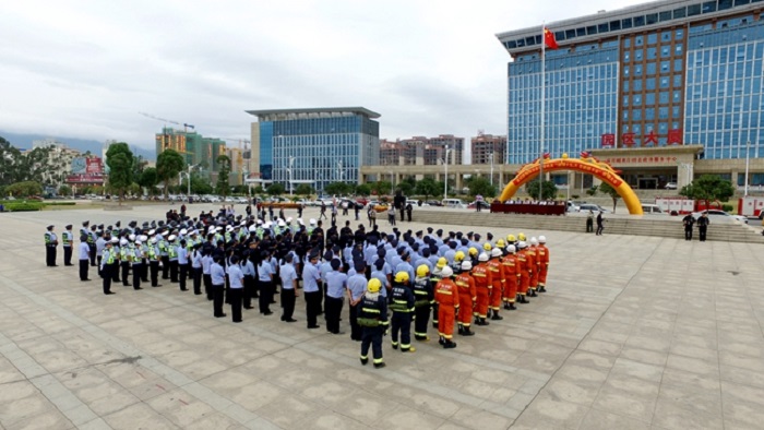 誓师大会结束后,城区警务大队、武警富川中队采用车巡的方式从民族文化广场出发,沿凤凰路、老汽车站、大屏幕、建设路、新永路至公安局大院路线开展巡逻。