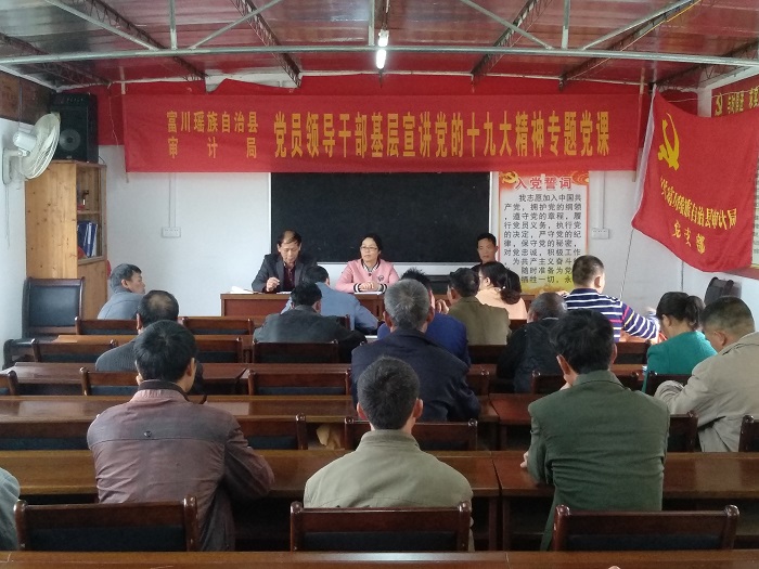 近日,富川县审计局党组书记、局长董丽娟及班子成员一同到城北镇巍峰村宣讲党的十九大精神。巍峰村两委干部、部分党员及村民代表等36人参加了会议。