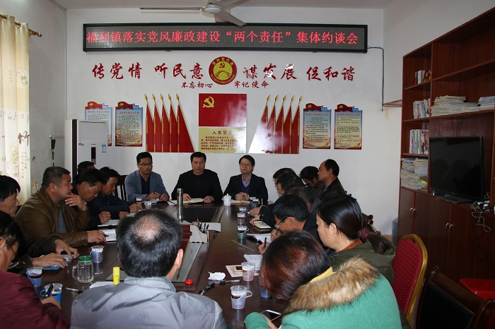 为全面落实党风廉政建设“两个责任”,强化党员领导干部遵守党纪党规意识,加强对干部的常态化教育管理。12月27日下午,福利镇召开全镇落实党风廉政建设“两个责任”集体约谈会。镇党委书记毛靖对全镇党支部书记、各村监督委员会主任等共计25人进行集体约谈。